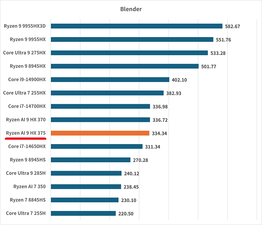 Blenderのスコアは334.34となる。Ryzen AI 9 HX 370との差は2.38ptとわずかでやはり同等といえる。Core i7-14650HXよりも7%高く、Core Ultra 7 255HXよりも13%低い数値だ。レンダリング性能も高いCPUとなっている。