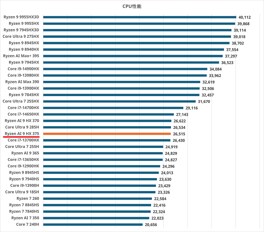 Ryzen AI 9 HX 375のCPU性能スコアは26,515と高い数値だ。Core Ultra 9 285HやCore i7-14650Xと同程度の性能を持っている。Intelのハイエンドモデルと同等のパフォーマンスを持っているのは頼もしい。なお、AI性能だけが異なるはずのRyzen AI 9 HX 370の方がスコアが高いが、計測するモデルや環境によって変化するためだ。基本的には同等の性能を持つモデルだと考えてよいだろう。
