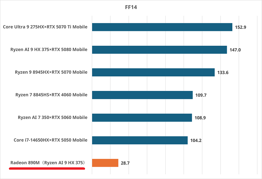 最高品質でのフレームレートをまとめている。Radeon 890Mは28.7fpsと苦しい結果となっている。GeForce RTX 5050 Mobile搭載モデルとの性能差は大きく72%程度低い。参考まで高品質で44.8fps、標準で46.19fpsとなる。FSR(アップスケーリング)を有効化してもそこまで伸びない。ゲーム自体がプレイできないことはないが快適とは言えないだろう。