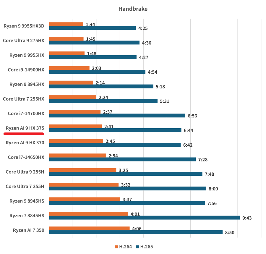 動画のエンコード処理に掛かる時間を計測している。Ryzen AI 9 HX 375についてH.264の処理に掛かる時間は2分41秒で、H.265では6分44秒だ。Ryzen AI 9 Hx 370もパフォーマンスはほとんど変わらない。Core i7-14650HXよりもH264では13秒速く、H.265では44秒も速い。Core Ultra 7 255HXと比べるとH.264で17秒遅く、H.265でも1分11秒遅い。Core Ultra 7 255HXとの性能差は大きい。