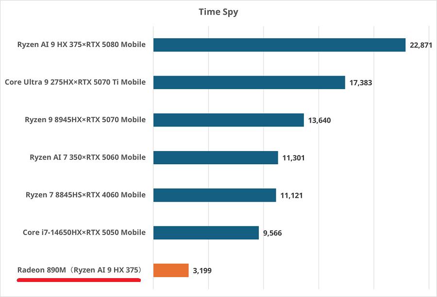 Ryzen AI 9 HX 375の内蔵グラフィックスは、iGPUとしては高性能なRadeon 890Mだ。GeForce GTX 1060 MobileやGeForce RTX 2050 Mobileと同等の性能を持つ。内蔵グラフィックスとしては性能が高くゲームプレイにも対応できなくはないが、今のところグラフィックボード非搭載モデルが販売されておらず実際のゲーム環境で活かす場面は少ないだろう。上位モデルであるRyzen AI Max+ 395に搭載されているRadeon 8060Sの存在もあり、メーカーからするとRyzen AI 9 HX 375の立ち位置を考えるのが難しいのかもしれない。ベンチマーク計測以外で活用する場面はなさそうだ。