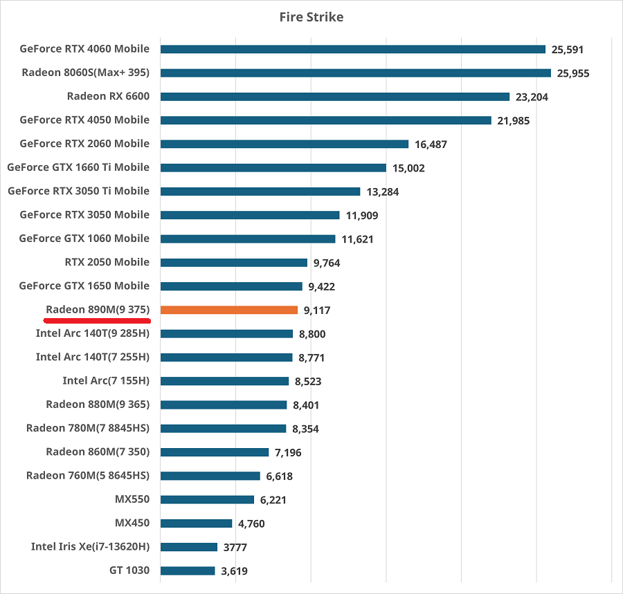 Fire Strikeにおけるグラフィックスのスコアは9,117となる。これはGeForce RTX 2050 MobileやGeForce GTX 1650 Mobileに匹敵するスコアだ。競合のIntel Arc 140Tと比べてもパフォーマンスは高い。やはり内蔵グラフィックスとしては高い性能を持っているといえるだろう。