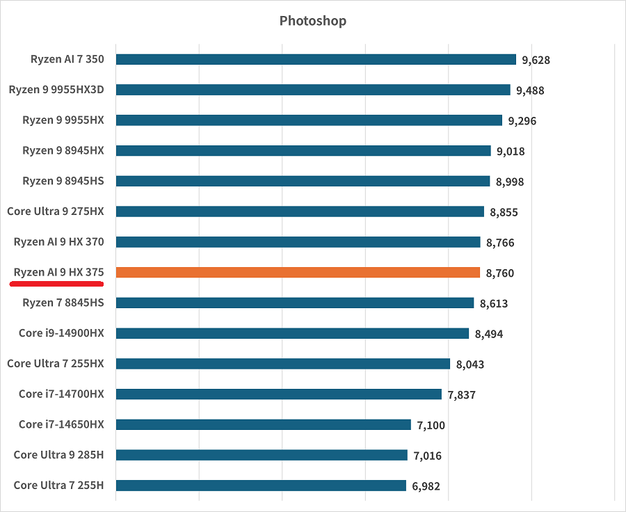 PugetBenchを活用してPhotoshopのパフォーマンスを計測した。スコアは8,760ptとまずまずの数値だ。AMD製CPUとの相性がよくCore i7-14650HXどころかCore i9-14900HXでさえも上回っている。Core Ultra 9 275HXともほとんど性能差がない。トップがRyzen AI 7 350なのは不思議だ。あくまでもベンチマークソフトの数値であることを理解しておいて欲しい。