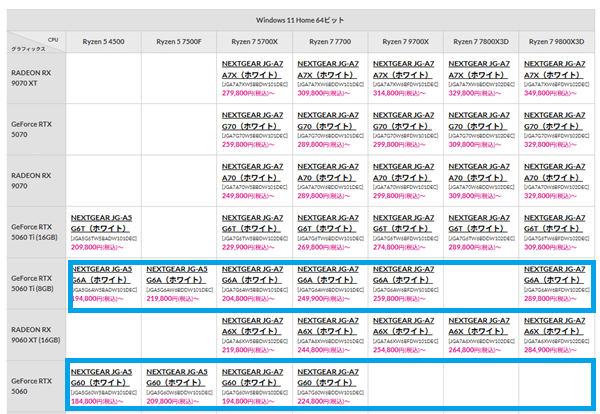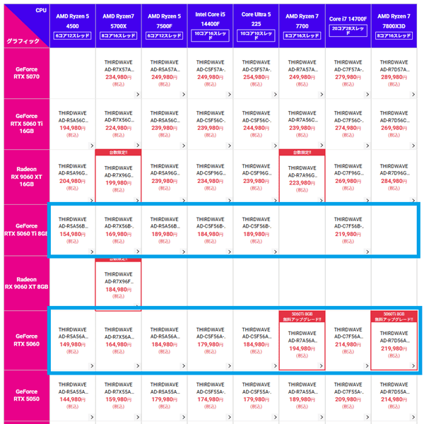 BTOではRTX 5060 Ti 8GB搭載モデルとの価格差が縮まる