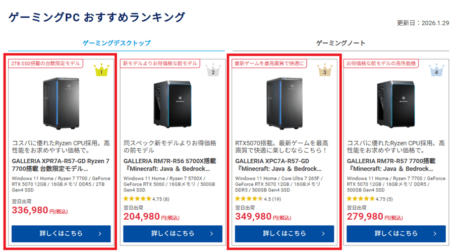 GeForce RTX 5070は単体のグラフィックボードとしてみると競合に見劣りしてしまう部分があるが、BTOパソコンでは高い人気を誇る。国内No.1のBTOメーカーであるドスパラのGALLERIAブランドでもおすすめランキングの1位と3位がGeForce RTX 5070搭載モデルとなっている。廉価ブランドのTHIRDWAVE-Gシリーズでも同様にGeForce RTX 5070搭載モデルがNo.1だ。