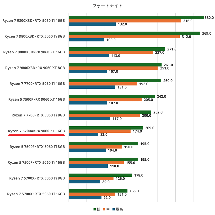 フォートナイトはCPU性能が重要になるタイトルだ。Ryzen 5 7500F搭載モデルと比べると低設定で10%弱、中設定で15%、最高設定で23%低い。3D V-Cache搭載モデルはフレームレートが伸びやすい。