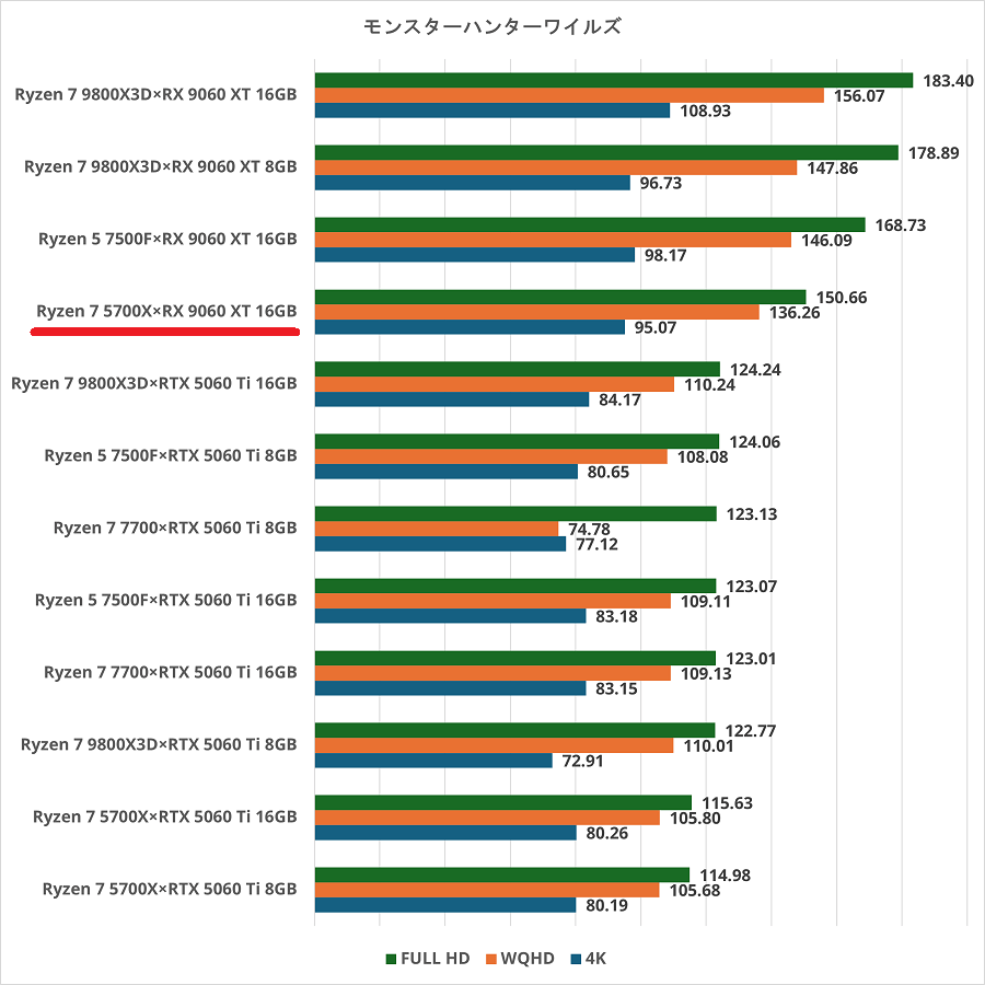モンハンワイルズはRadeon RX 9060 XT 16GBとの相性がよくRyzen 7 5700Xでもフレームレートは伸びやすい。Ryzen 5 7500Fとの組み合わせと比べると10%程度低くなるが、その分価格が安くコストパフォーマンスは上々だ。Ryzen 7 9800X3D搭載モデルとの性能差は18%と大きい。