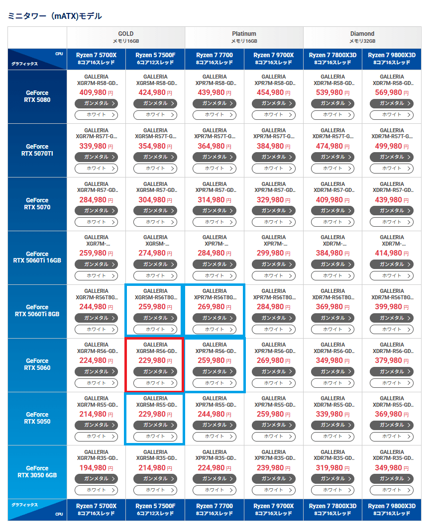 GALLERIA XGR5M-R56-GD Ryzen 5 7500F-lineup