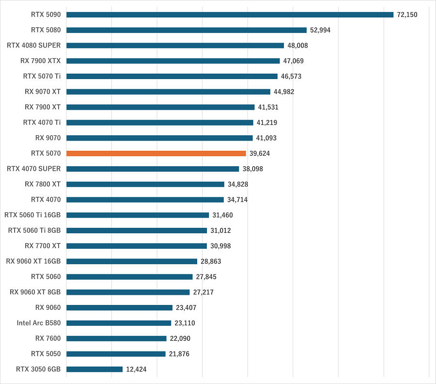 GeForce RTX 5070は、Blackwell世代のハイクラスモデルだ。従来モデルのGeForce RTX 4070と比べて15%弱高く、GeForce RTX 4070 SUPERを上回る。DLSS 4.0あるいはマルチフレーム生成という新しい武器を手に入れて高いパフォーマンスを期待できる。ソフトの面でも強化され従来モデルとは数字以上の差があると考えてよい。競合のRadeon RX 9070と比べると4%弱低くなっているが、ターゲット的にはWQHD環境と共通だ。