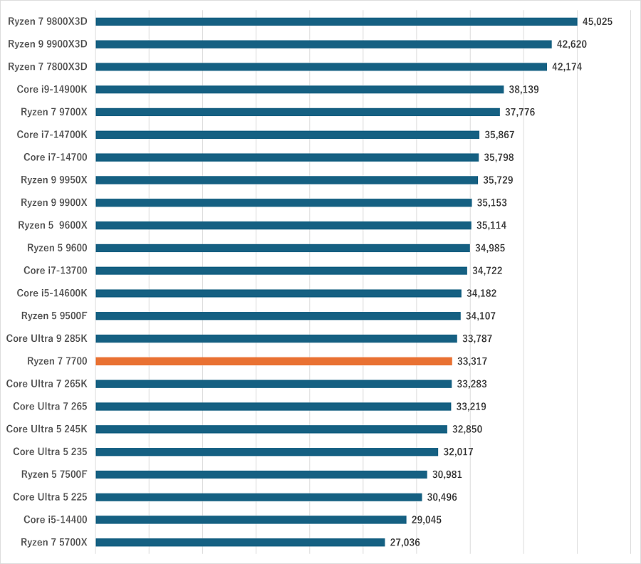 Ryzen 7 7700は、Zen 4アーキテクチャを採用した高パフォーマンスモデルだ。従来モデルのRyzen 7 5700Xと比べて23%もゲーム性能が高い。競合のCore Ultra 7 265と比べてもパフォーマンスは上だ。70番台や60番台のグラフィックボードとの組み合わせがおすすめだ。マルチコア性能はIntel製CPUに劣るものの最低限必要な性能を持つ。オールラウンドに対応できるモデルだといえるだろう。