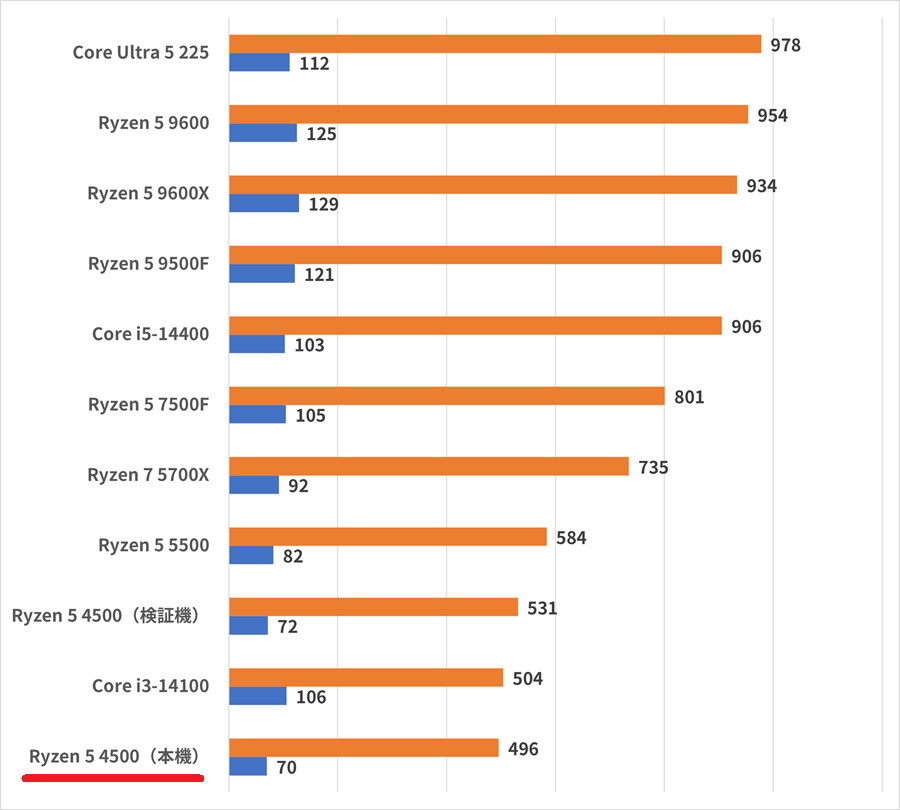 Ryzen 5 4500のマルチコアスコアは496で、シングルコアスコアは70だ。Core i3-14100と同等だが、シングルコア性能は劣る。Intel第14世代のCore i5-14400と比べるとマルチコア性能は42%低く、シングルコアスコアは33%低い。今手に入るCPUで最も性能の低いCPUだ。あまり過度な期待はしない方がよいだろう。
