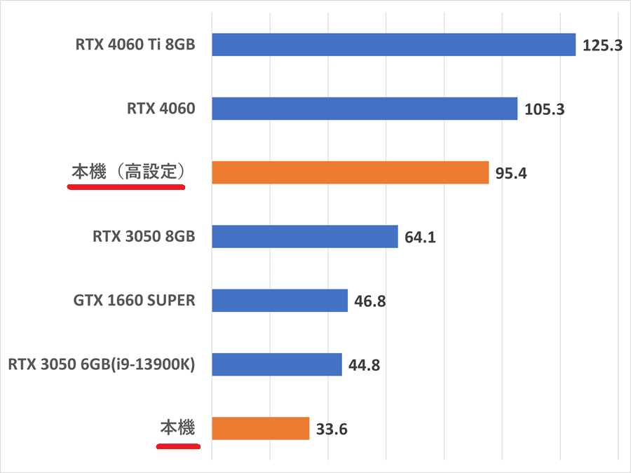 Forza Horizon 5(エクストリーム)での平均fpsは33.6fpsだ。高設定まで下げれば95.4fpsを実現できる。