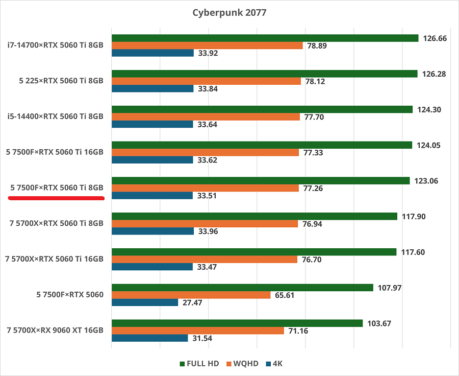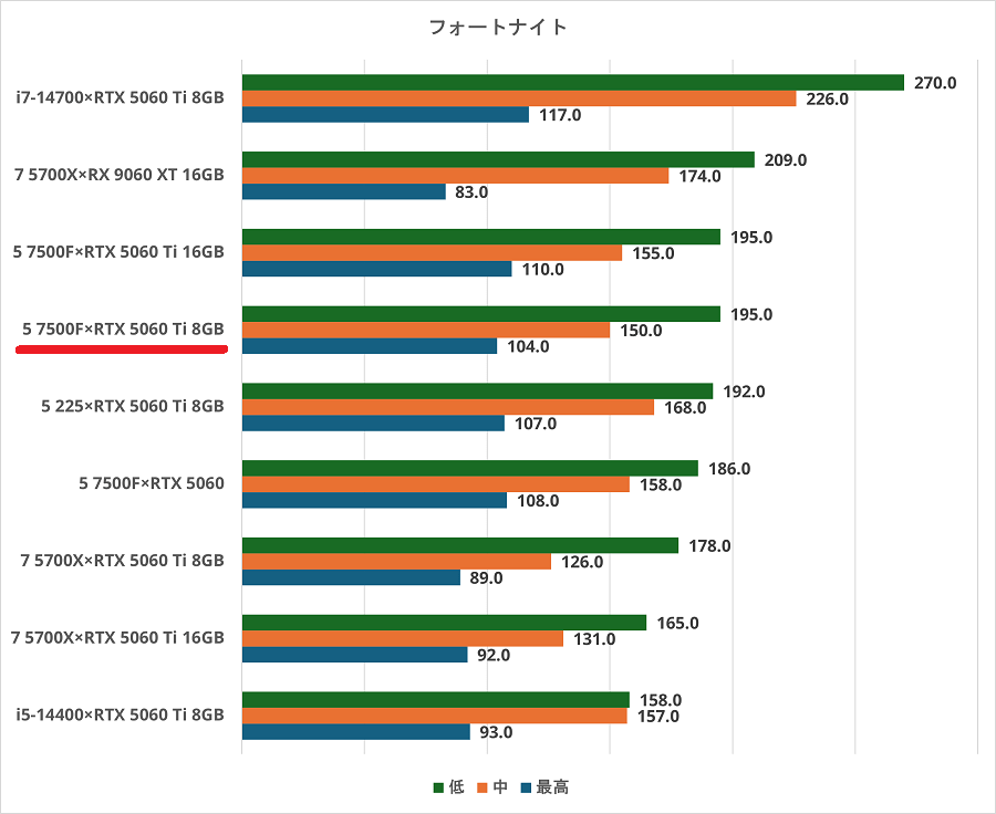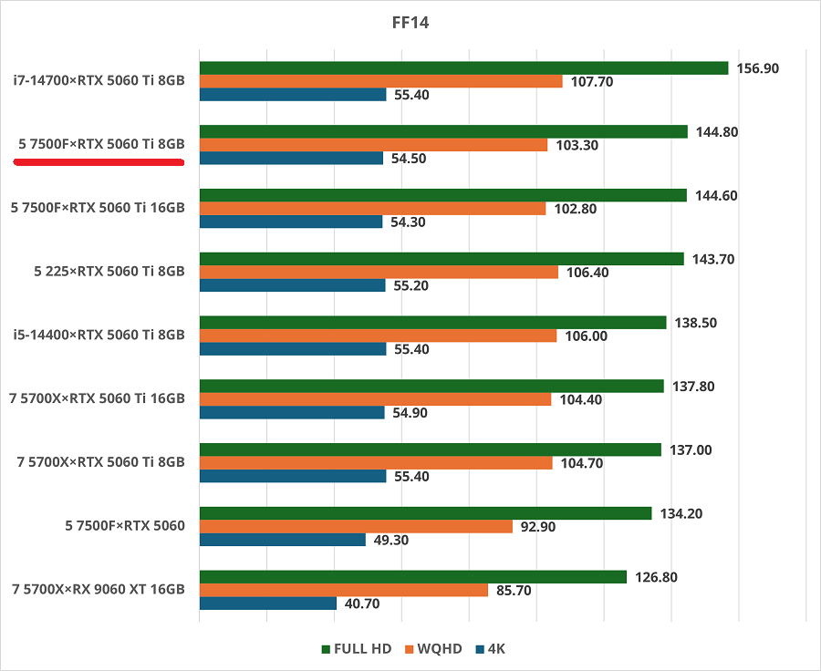 Ryzen 7 5700X搭載モデルよりも10%-20%程度フレームレートが高い。このクラス帯ではトップクラスのパフォーマンスを発揮する。VRAM 16GB版のGeForce RTX 5060 Tiと比べてもパフォーマンスは変わらない。
