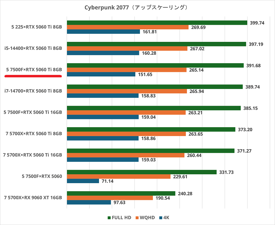 Ryzen 5 7500Fは十分すぎるフレームレートが出ている。Ryzen 7 5700X搭載モデルよりも5%弱高い。Radeon RX 9060 XT 16GB搭載モデルはフレームレートが伸びづらい。アップスケーリング技術についてはGeForce RTX 5060 Ti 8GBが優勢だ。