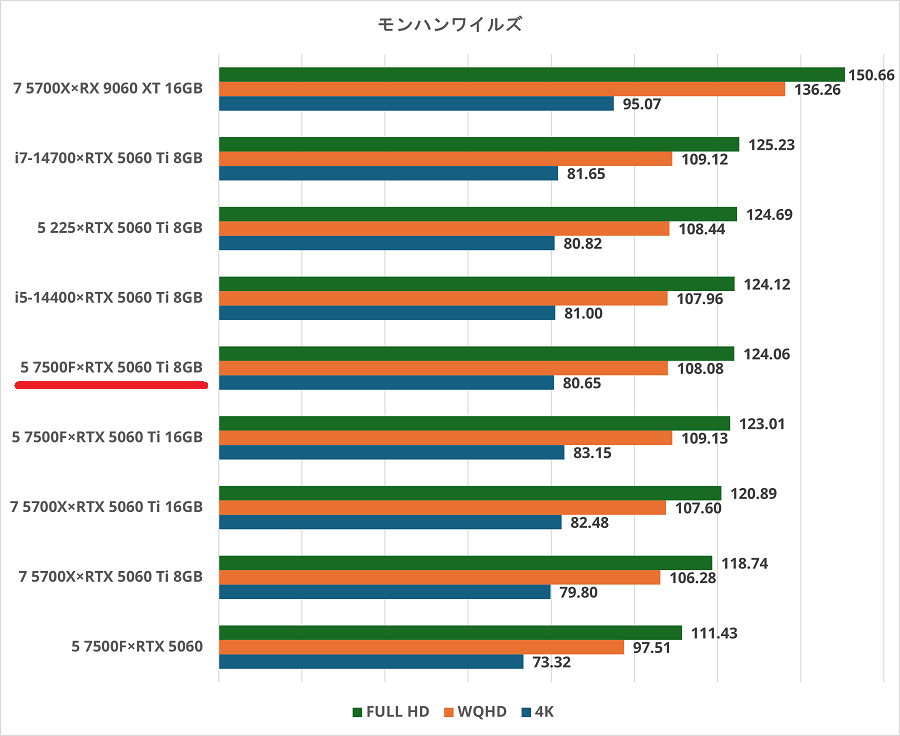モンスターハンターワイルズではRyzen 7 5700X搭載モデルが少しフレームレートが落ちるもののおおよそどのモデルでも同等のフレームレートを期待できる。Radeon RX 9060 XT 16GBはモンスターハンターワイルズとの相性がよく高いフレームレートを実現できる。