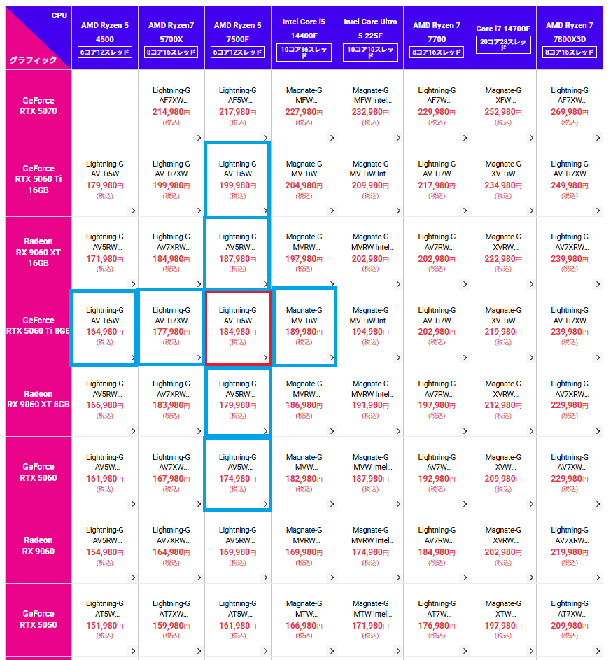赤枠で囲っているモデルが当ページで紹介しているLightning-G AV-Ti5W Ryzen5 7500F/RTX5060Ti 8GB搭載だ。青枠は比較対象となりそうなモデルだ。12月13日にRyzen 7 5700X搭載モデルが157,980円→177,980円へと2万円も高くなってしまい、Lightning-G AV-Ti5Wは相対的に評価を上げた。Core i5-14400F搭載モデルよりも5,000円も安くなっている。性能を考えればRyzen 5 7500F搭載モデルの方が上だ。将来的に3D V-Cache搭載モデルへのアップグレードがしやすいのも大きなメリットといえる。
