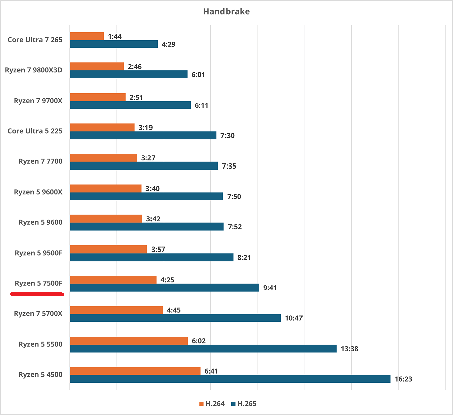 動画のエンコードに掛かる時間を計測している。H.264で4分25秒、H.265で9分41秒だ。Ryzen 7 5700XよりもH.264が20秒早く、H.265でも1分6秒速い。8コア16スレッドのCPUに勝つのは驚きだ。