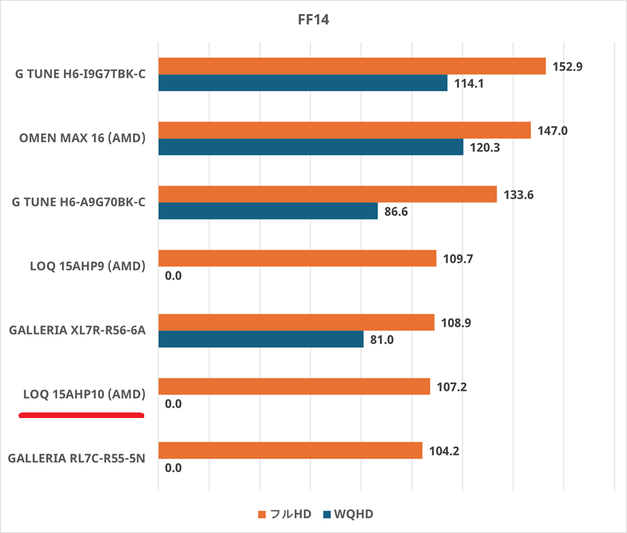 FF14ではフルHDで107.2fpsとまずまずの数値だが、前世代のGeForce RTX 4060 Mobile搭載の「Lenovo LOQ 15AHP9 (AMD)」よりもフレームレートが低くなっている。CPU性能の差が出ているのかもしれない。それは「GALLERIA RL7C-R55-5N」とのフレームレートの差も根拠となりそうだ。100fpsを超えているのはパフォーマンス的には十分だろう。