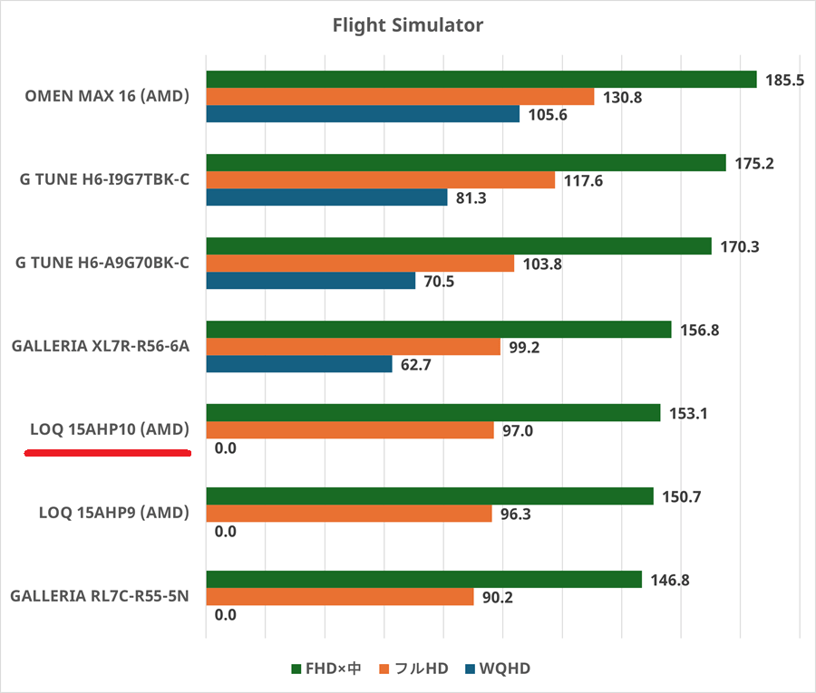フライトシミュレーターは中設定で153.1fps、ウルトラ設定で97.0fpsとなる。144Hzモニターを活かすには十分なフレームレートといえるだろう。