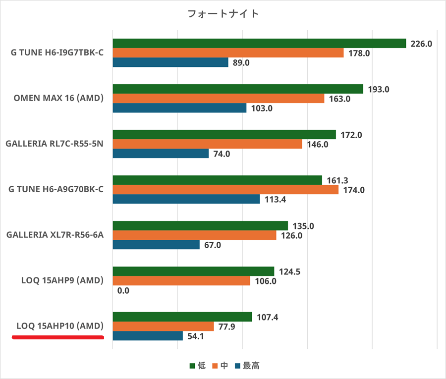 フォートナイトではGeForce RTX 4060 Mobile搭載モデルよりも低くなってしまった。これはGPUというよりもCPUが原因となっていそうだ。Ryzen 7 8845HSの方が性能が高くフレームレートが伸びやすいのだろう。Core i7-14650HX搭載のGALLERIA RL7C-R55-5Nのフレームレートが伸びていることからもわかるだろう。フォートナイトのようなGPU負荷の軽いタイトルではCPU性能がものを言う。