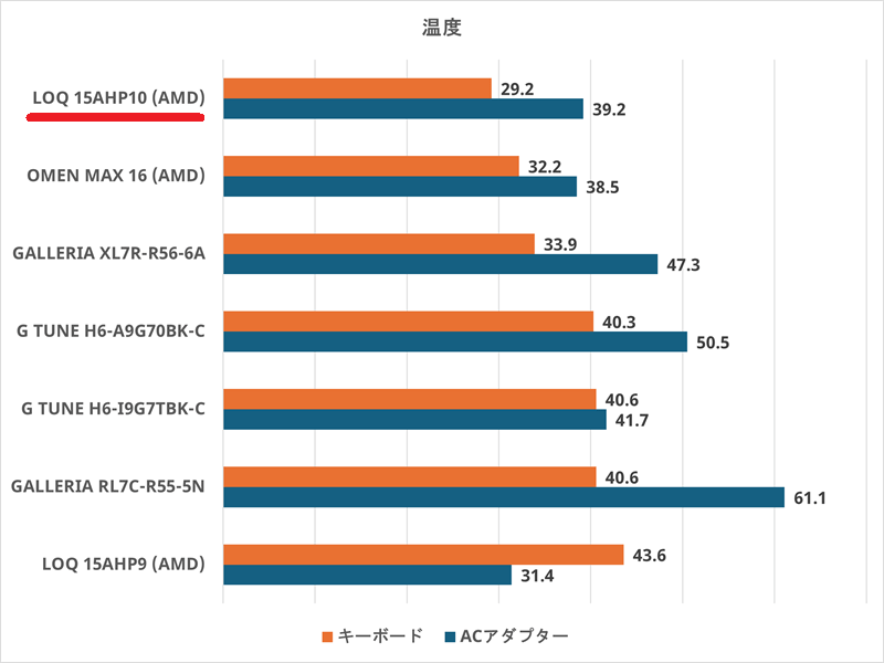 本体の発熱量は体感できるほど抑えられている。ゲームプレイ時でも29.2℃と低い。キーボードに触れていても不快さを感じることはない。アダプターの温度もそこまで高くならない。