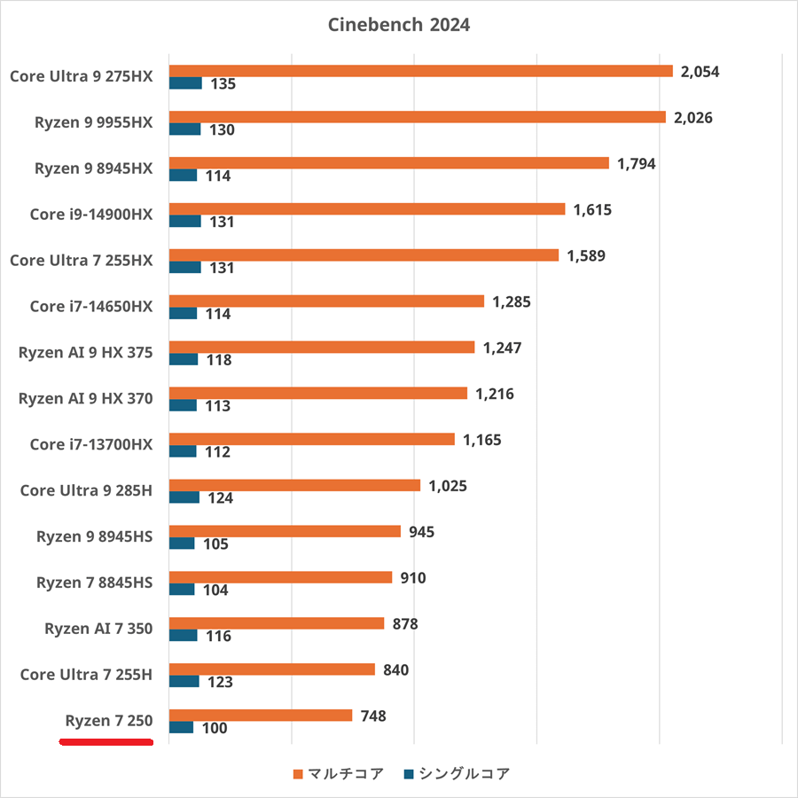マルチコアは748ptで、シングルコアは100ptだ。このラインナップの中でもっとも低いスコアとなっている。Ryzen AI 7 350と比べるとマルチコアが15%低く、シングルコアも14%低い。Ryzen 7 8845HSと比べてもスコアが低くなっている。クリエイティブ作業を本格的に行うにはやや物足りなさがある。