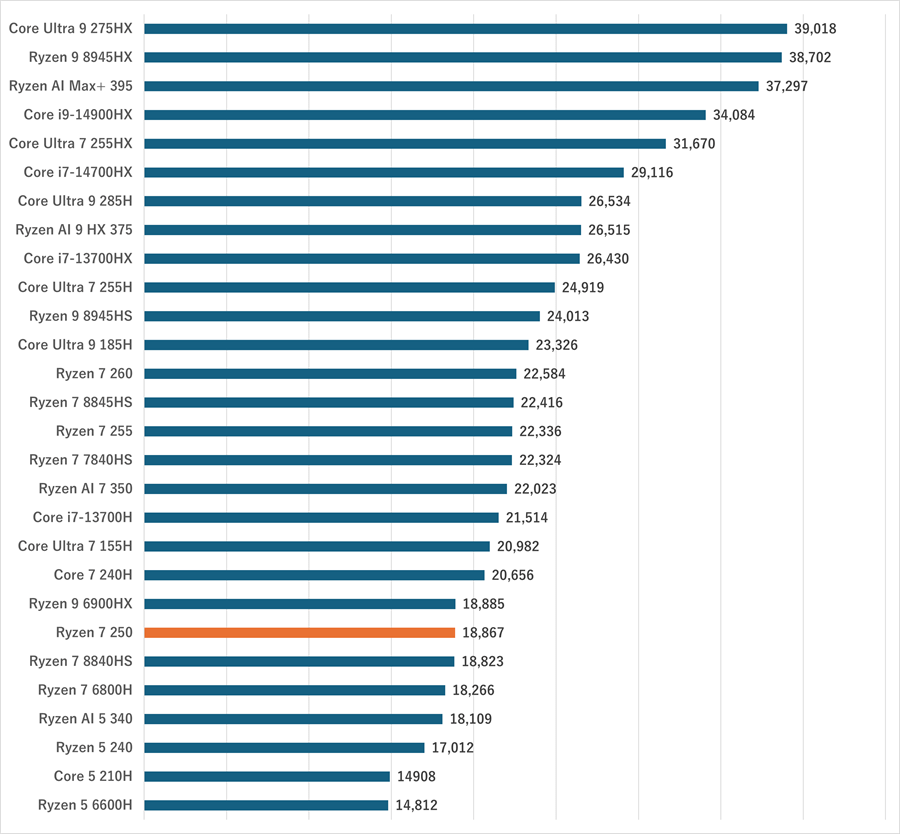 CPUはパフォーマンスよりも省電力性を重視したRyzen 7 250を搭載している。現行のラインナップで見れば下から数える方が早くなっている。旧世代のRyzen 7 8840HSやRyzen 7 6800Hと同程度の性能を持つ。上位モデルであるRyzen 7 255やRyzen AI 7 350よりもよりも15%前後低くなっている。フレームレートを高めたいタイトルではやや不利になる可能性がある。最低限のゲーム適性を持つと考えておこう。