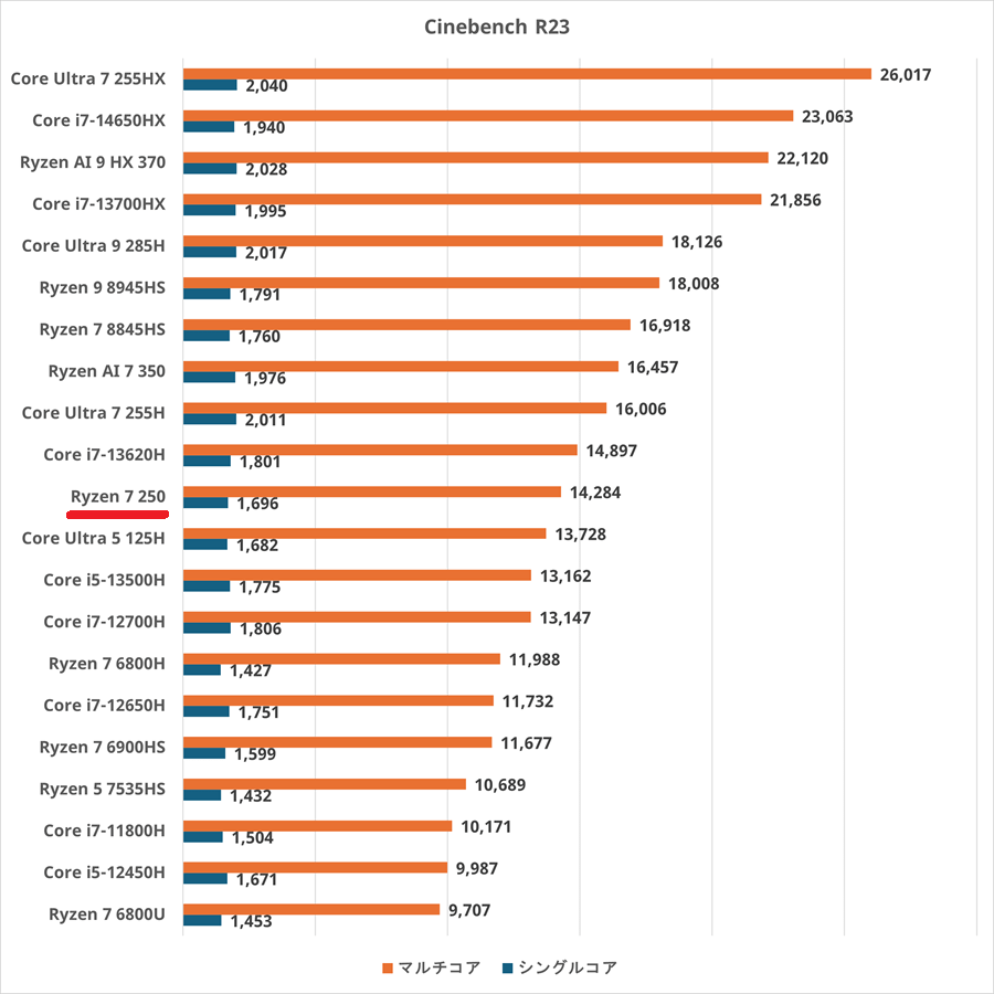 Cinebench R23ではより多くのデータを保有しているのでより比較が行いやすい。Zen 3+のRyzen 7 6800Hと比べるとマルチコアが20%弱、シングルコアも13%高くなっている。旧モデルでいえばハイクラス相当の性能を持っている。