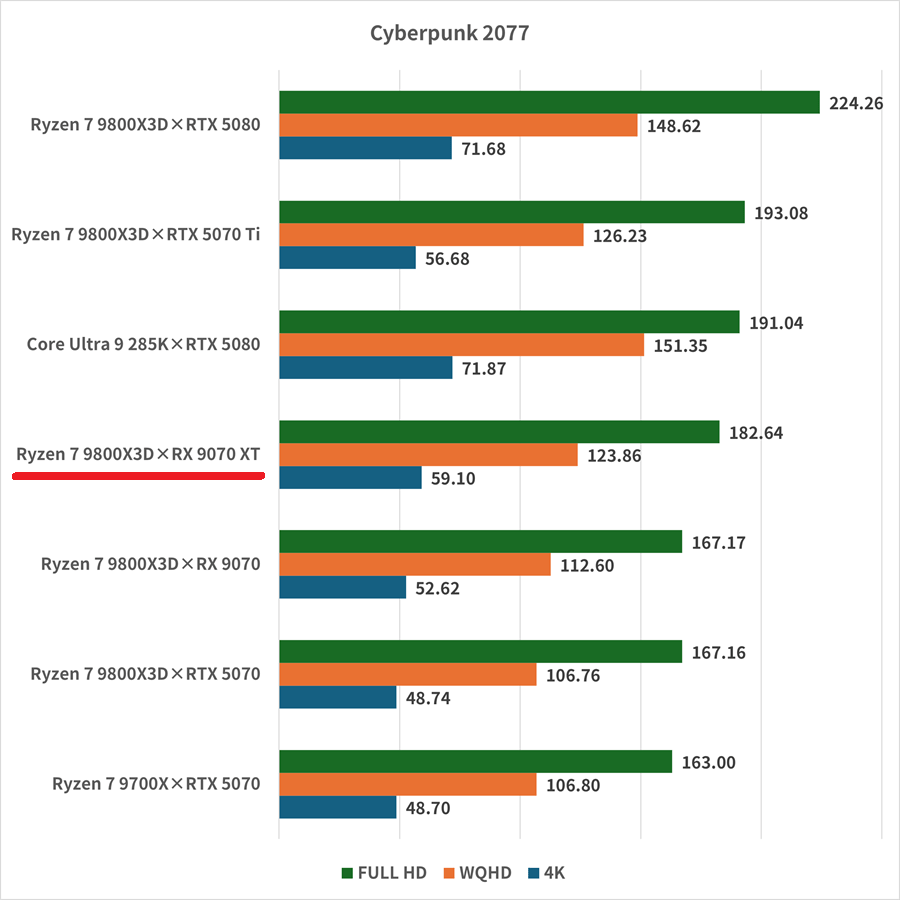 設定ウルトラでのフレームレートを計測した。フルHDで182.64fps、WQHDで123.86fps、4Kで59.10fpsを実現している。NVIDIA GeForce RTX 50シリーズと比べるとややフレームレートは低くなってしまう。これは相性の問題だろう。