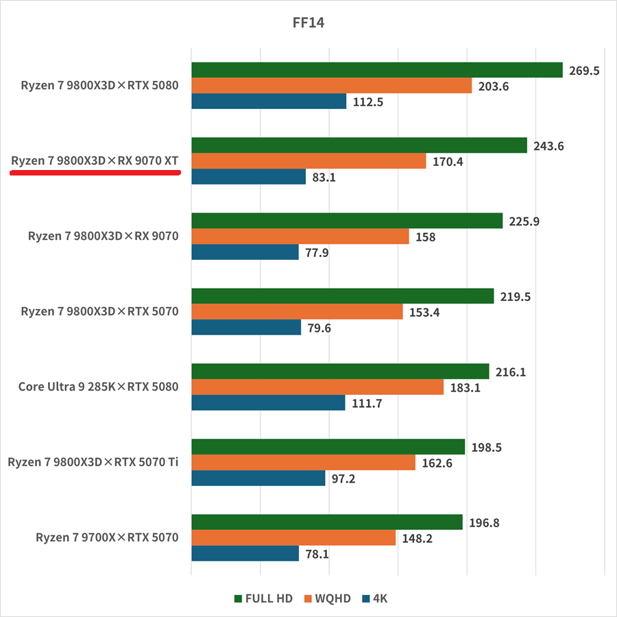 2010年に登場し、すでに16年目に突入したFF14は意外と負荷が高い。古いタイトルでも大型アップデートで要求スペックが底上げされていくからだ。負荷が上がっているFF14でもフルHDで243.6fpsも出せている。注目はWQHDの170.4fpsだ。FF14は横長の解像度に設定すると、視野も横に広がる。そのため、UWFHD(ウルトラワイドフルHD。2560×1080)がFF14では人気であり、有利な解像度である。UWFHDは横幅がWQHD、縦幅がフルHDと同じだ。つまり負荷はWQHDよりも少し軽くなる。WQHDで170.4fpsを出せているなら、UWFHDでも近い数値で安定させられることになる。4Kでも83.1と十分な数値なので、UWFHDのひとつ上のUWQHD(3440×1440)でも安定させられそうだ。