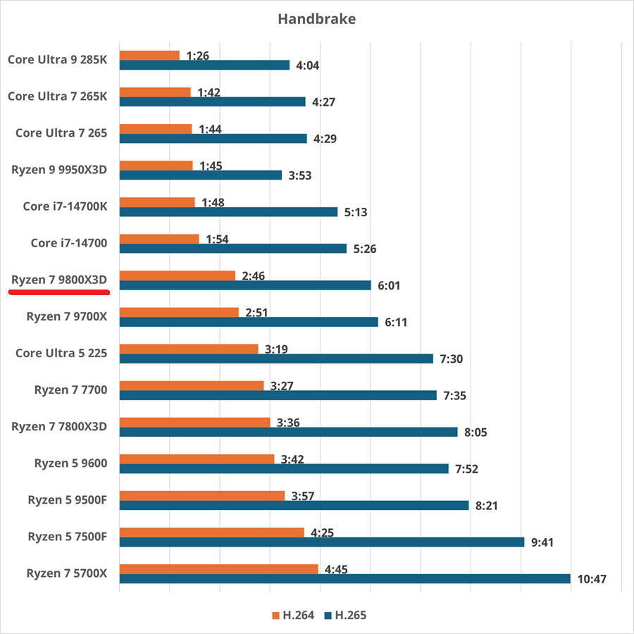 動画のエンコードにかかる時間を計測した。H.264で2分46秒、H.265で6分1秒となる。Ryzen 7 7800X3Dと比べるとH.264で50秒速く、H.265でも2分4秒速くなっている。3D V-Cacheの配置変更の効果が出ている。やはり競合のCore Ultra 7 265Kとの性能差は大きいが及第点といえそうだ。ある程度のクリエイティブ作業にも対応できる。