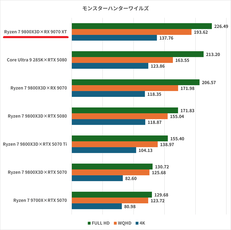 WQHDで193.6fps、4Kでも137.8fpsと十分過ぎるフレームレートだ。モンスターハンターワイルズも環境を気にせず快適にプレイできる。また、VRAM 16GB搭載であるため、画質を大幅に向上させるDLC「高解像度テクスチャパック」も適用可能だ。モンハンワイルズを遊び尽くせる性能を有している。