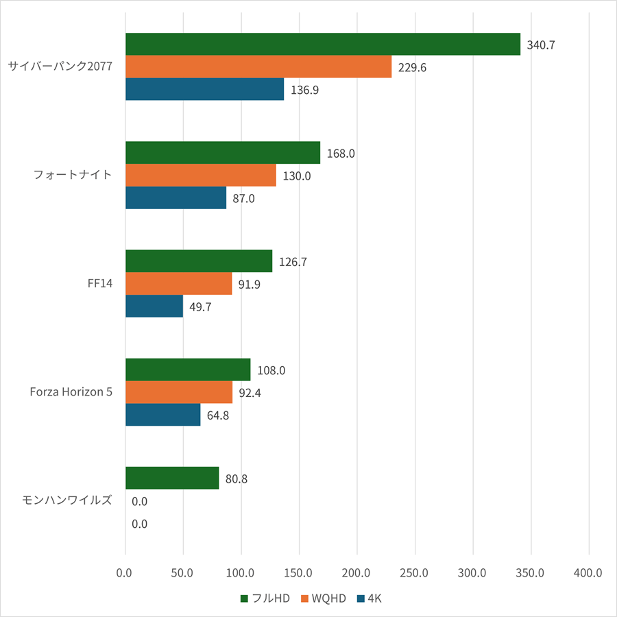 「FF14」は設定を最高品質でDLSSをオフにして計測している。少し古いゲームなのでフルHDでも126fpsだ。DLSSや設定を見直せば144fps以上に期待できる。WQHDでも91fpsと上々だ。4Kになると50fpsを下回り、さすがに快適とは言えない水準である。設定を下げればフレームレートは伸ばせるが、高解像度でそれは本末転倒だろう。FF14はUWFHD(ウルトラワイドフルHD。2560×1080)がゲームを有利に進める解像度として人気だ。フルHDとWQHDの中間的な負荷と考えると、十分快適にプレイできるので安心だ。