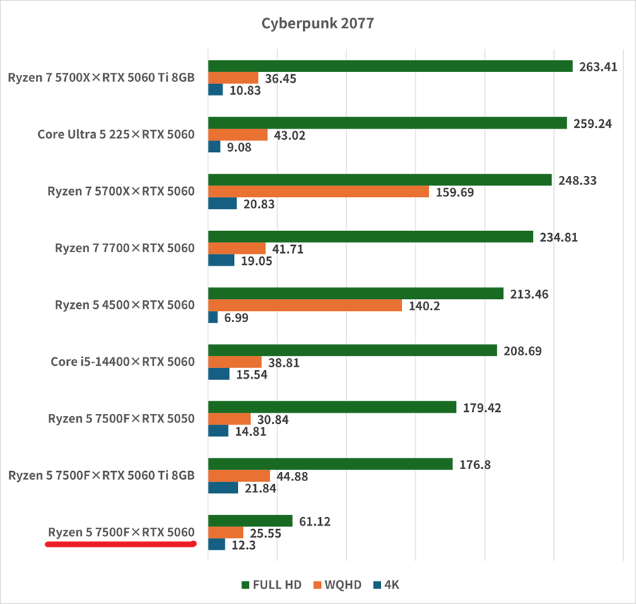 サイバーパンク2077は、レイトレーシングとDLSS 4.0を有効にして計測している。なぜかフレームレートは同じGeForce RTX 5060搭載モデルと比べて大きく落ちる。GeForce RTX 5050と比べても、フルHDで半分以下の61.12fpsだ。レイトレーシング+DLSS 3.0やDLSS 4.0のみの場合は正常値が出ているので今回の計測時はたまたまだったのかもしれない。この結果はそこまで気にしなくてもいいだろう。