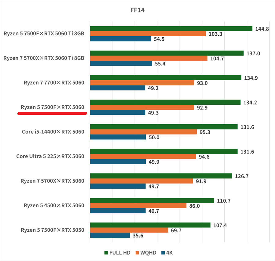 FF14では必要十分な性能を発揮している。FF14はUWFHD(ウルトラワイドフルHD。2560×1080)の横長解像度がゲーム進行で有利になる。16:9では見えない部分が見えるようになるからだ。横幅はWQHD、縦はフルHDの解像度なので、WQHD相当の負荷を想定しておきたい。WQHDでも91.9fps出ているので、十分ワイド解像度を実現できる。4K解像度は快適とは言えないフレームレートだ。画質を求めたゲームプレイには適していない。