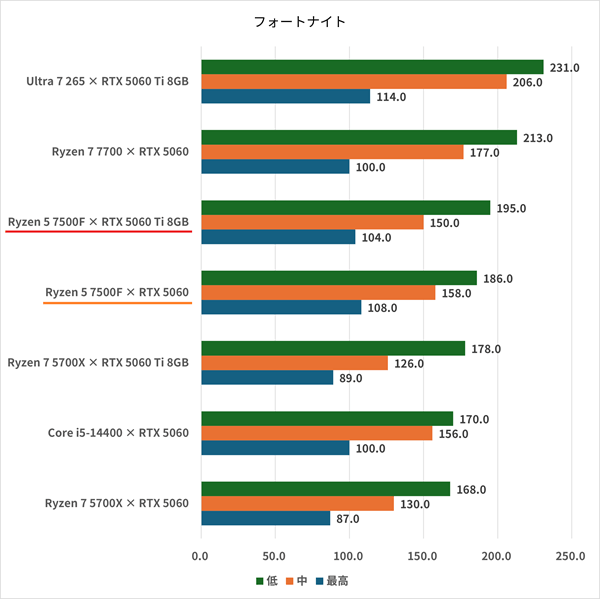 フォートナイトはフルHDでのプリセット最高・中・低で計測した。プリセット低で195fps、中でも150fpsとなかなかのフレームレートだ。GeForce RTX 5060と比べてフルHDよりは高いものの、プリセット中・最高では下がる。フォートナイトはフルHDでプレイすることが多いゲームなので、GeForce RTX 5060 Ti 8GBへアップグレードされた恩恵は確実にある。プリセット低を基準にして、部分的に設定を高くしても144fps以上を維持できそうだ。144Hz~165Hz対応モニターの性能を活かせる。フォートナイトを快適にプレイできる性能を有している。