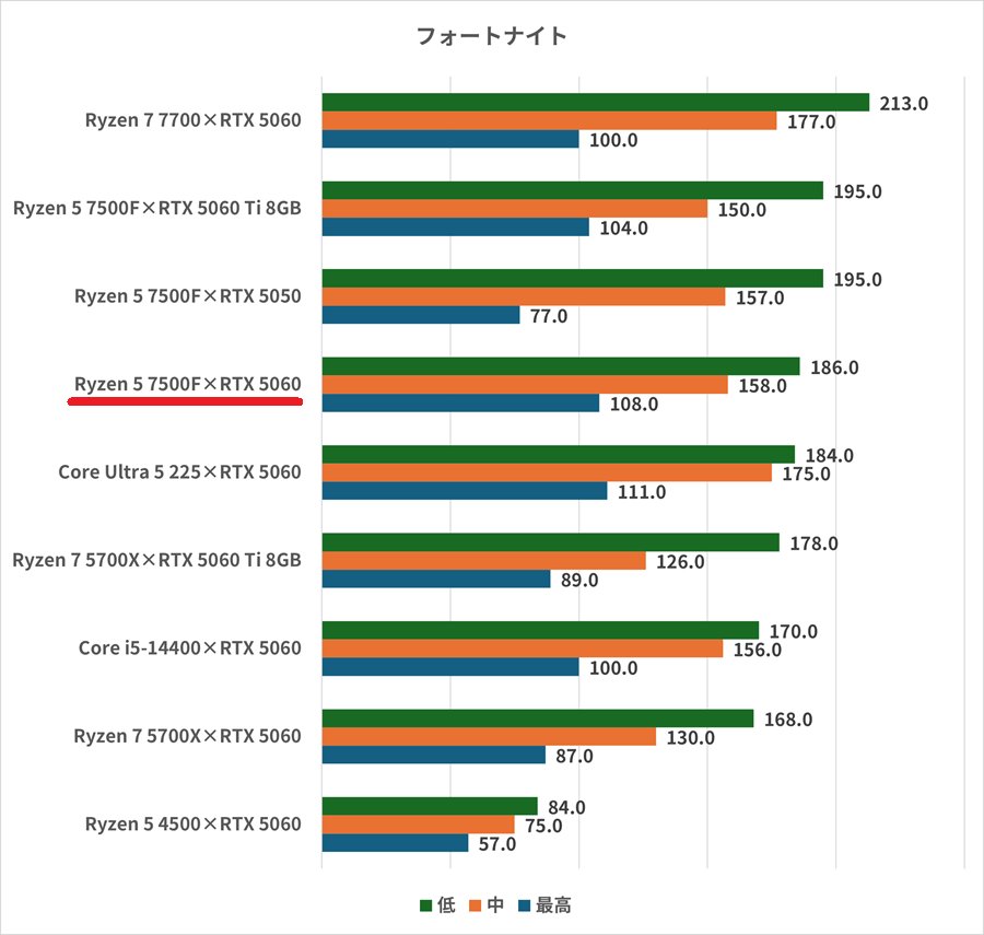フォートナイトはフルHDでのプリセット最高・中・低で計測した。プリセット低で186fps、中でも158fpsとなかなかのフレームレートだ。プリセット低を基準にして、部分的に設定を高くしても144fps以上を維持できそうだ。144Hz~165Hz対応モニターの性能を活かせる。フォートナイトを快適にプレイできる性能を有している。