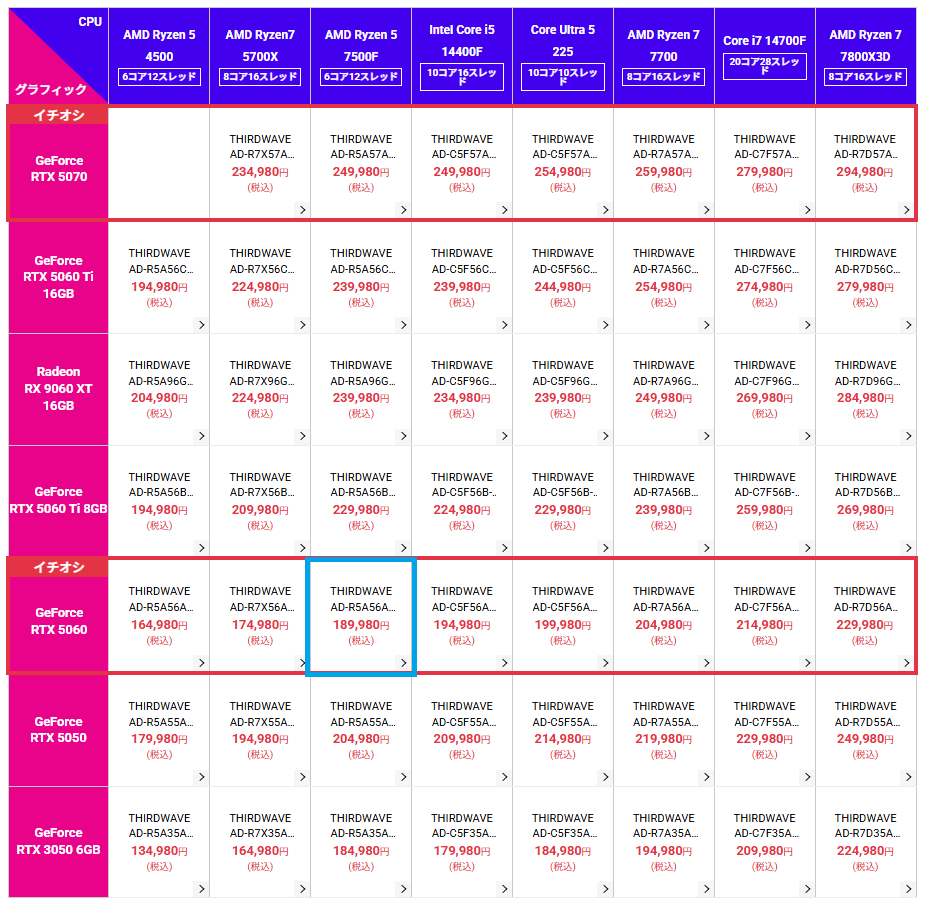 | 189,980円 | Ryzen 5 7500F | RTX5060 |