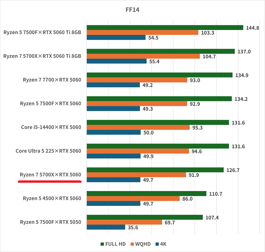 FF14の登場は10年以上前だが、定期的に大型アップデートが適用されて負荷が大きい。フルHDで126.7fpsと144fpsを維持できない。あまりフレームレートが重要なゲームではないので、そこまで大きな問題はないだろう。最も注目したいのはWQHDのフレームレートだ。91.9fpsと60fps以上を維持できている。