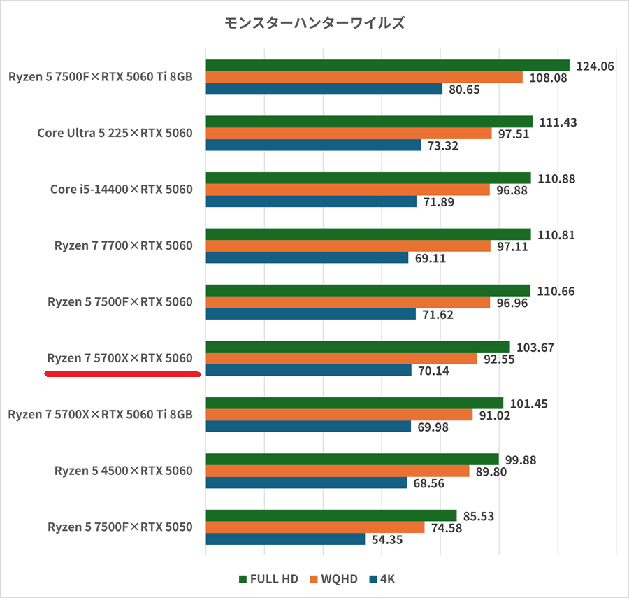 モンスターハンターワイルズはフルHDのみ計測可能で80.8fpsだ。フレームレートやリフレッシュレートがゲームの有利不利を決めるジャンルではないので、60fps以上あれば問題ない。Ryzen 5 7500Fとの組み合わせだと7%程度フレームレートが向上する。WQHDや4Kのような高解像度は計測不可で適正は低い。プレイ自体はできてもフレームレートが著しく低くなるなど快適なゲームプレイは難しいはずだ。